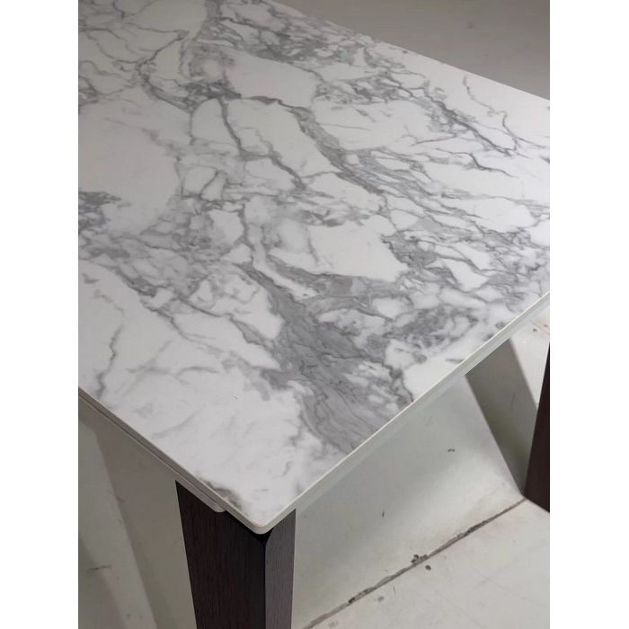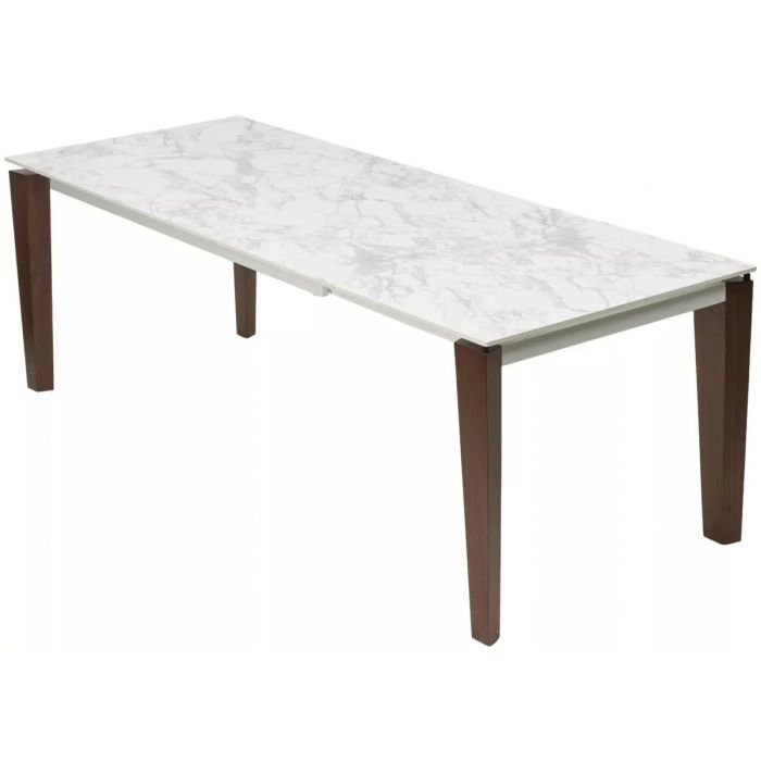 Стол ESMIR с матовой керамической столешницей белый мрамор; вставка 60 см выдвигается с торца столешницы; рисунок вставки может не совпадать и не являться продолжением рисунка основной столешницы; монолитная керамическая столешница, матовая, толщина 11 мм; рама - металл, цвет - белый; основание стола - массив березы, цвет - орех; Упакован в 2 коробки.